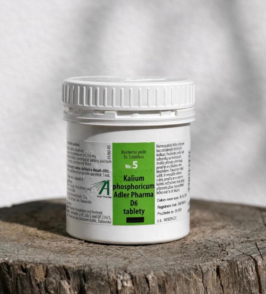 1 tableta obsahuje Kalium phosphoricum D6 250mg, monohydrát laktósy, kalium-behenát, bramborový škrob bez obsahu lepku a magnesia stearátu.